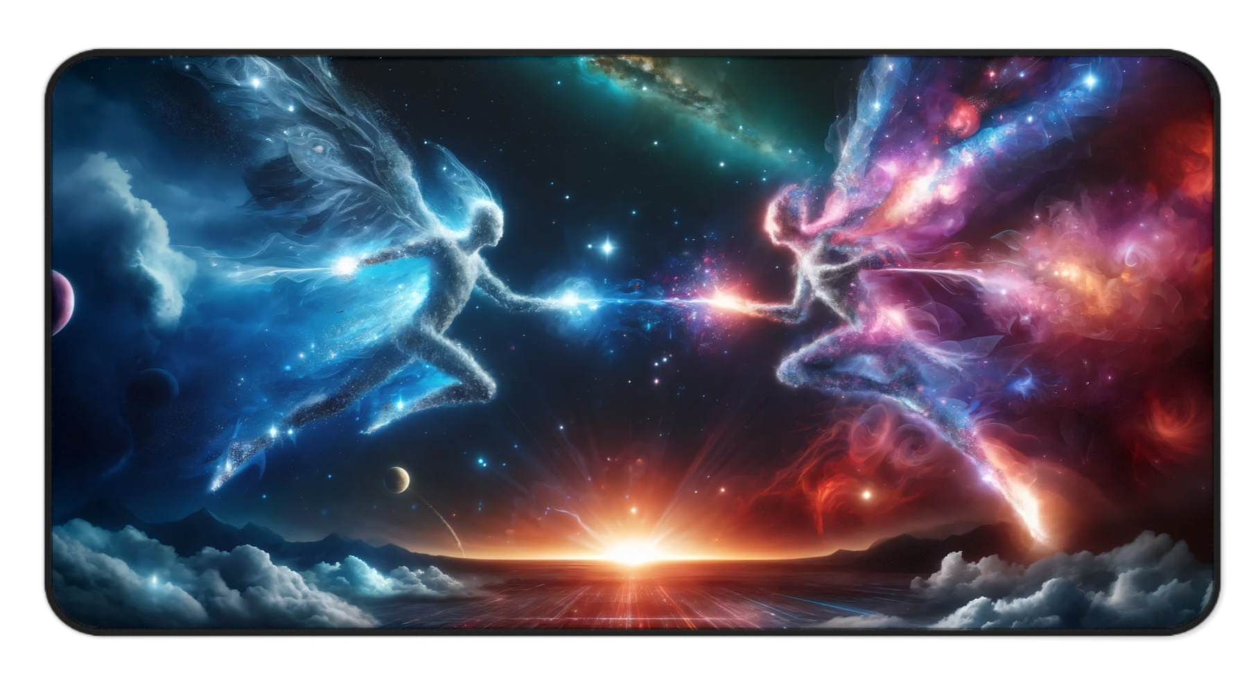 Elevate your gaming experience with the Celestial Duel Gaming Desk Mat. This 31.5"x15.5" desk mat showcases a breathtaking, high-resolution image of an epic battle between ethereal beings composed of stars and cosmic energy. The striking clash of good and evil set against a backdrop of a cosmic sunrise will captivate your senses and transform your workspace into an interstellar battlefield.