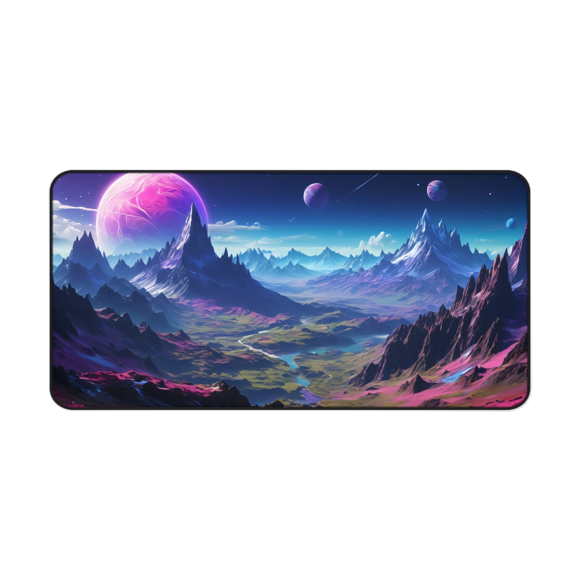 Elevate your gaming and workspace to the cosmos with the Celestial Peaks Gaming Desk Mat! Featuring breathtaking digital art of towering alien mountains under a vibrant, star-filled sky, this stunning landscape transports you to a far-off world. With brilliant pink planets looming above and glowing rivers winding through the vibrant valleys, this desk mat creates a sense of adventure, mystery, and exploration at every glance.
