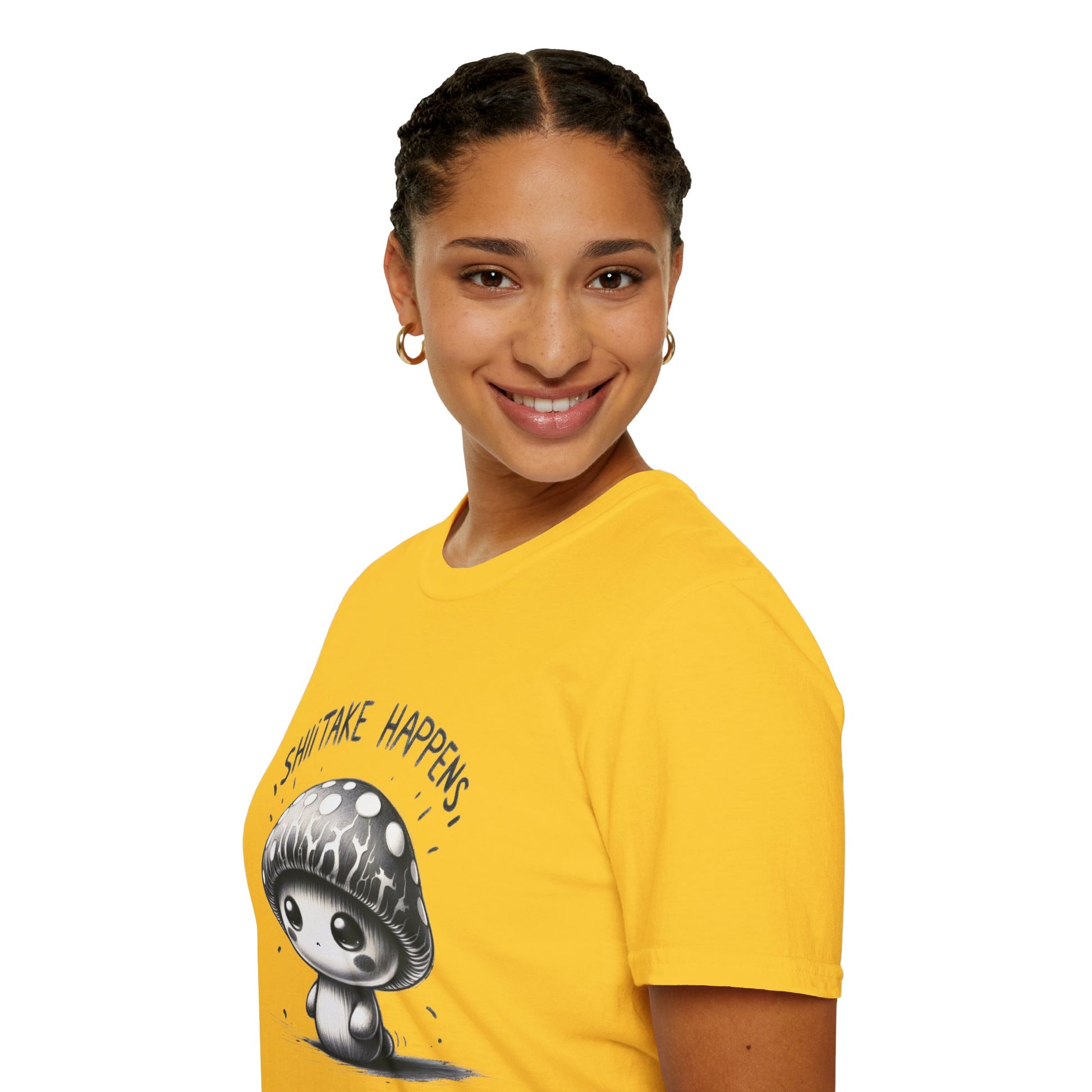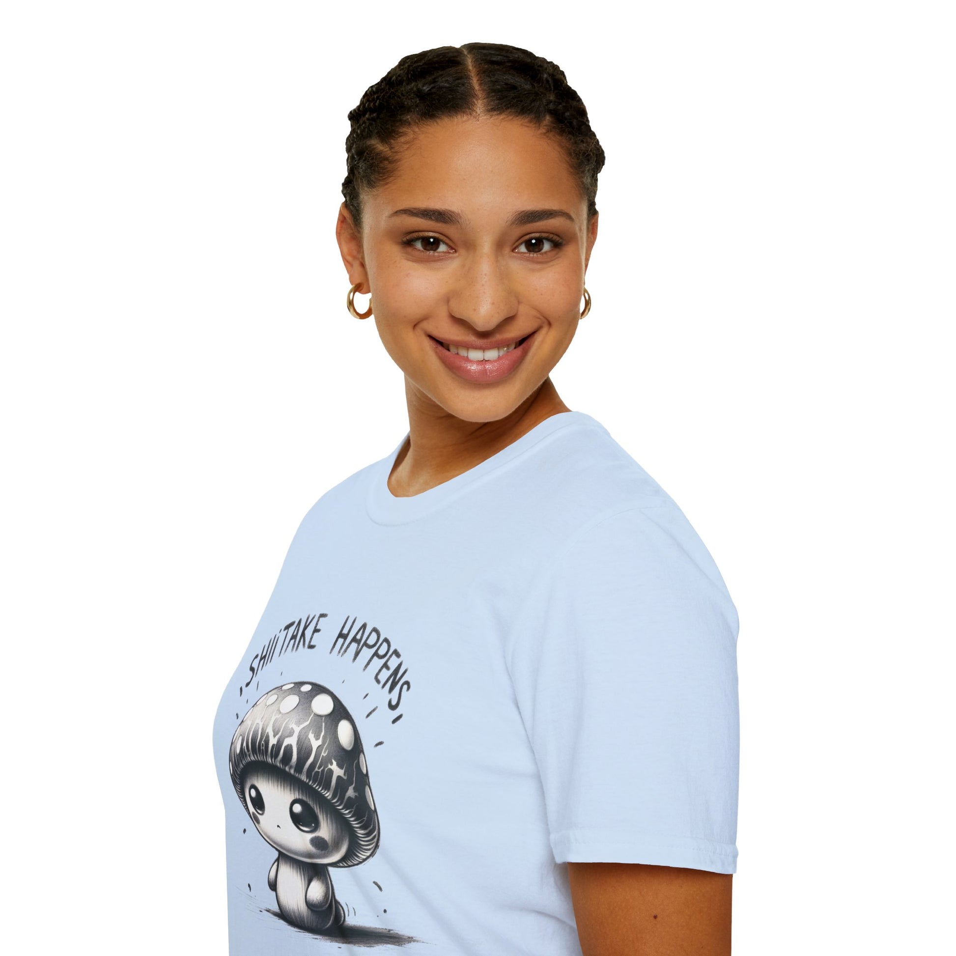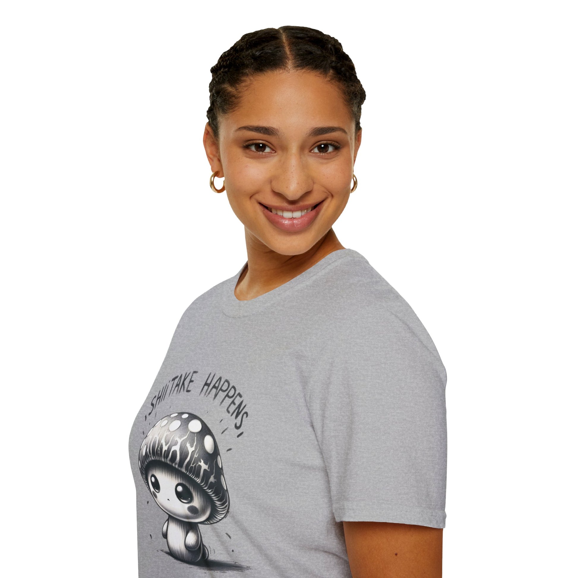 Embrace life's ups and downs with our 'Shiitake Happens' T-Shirt! This adorable monochrome tee features a charming mushroom character that brings a smile to your face, no matter what the day throws at you. Made for comfort and style, it's a playful addition to any casual wardrobe.