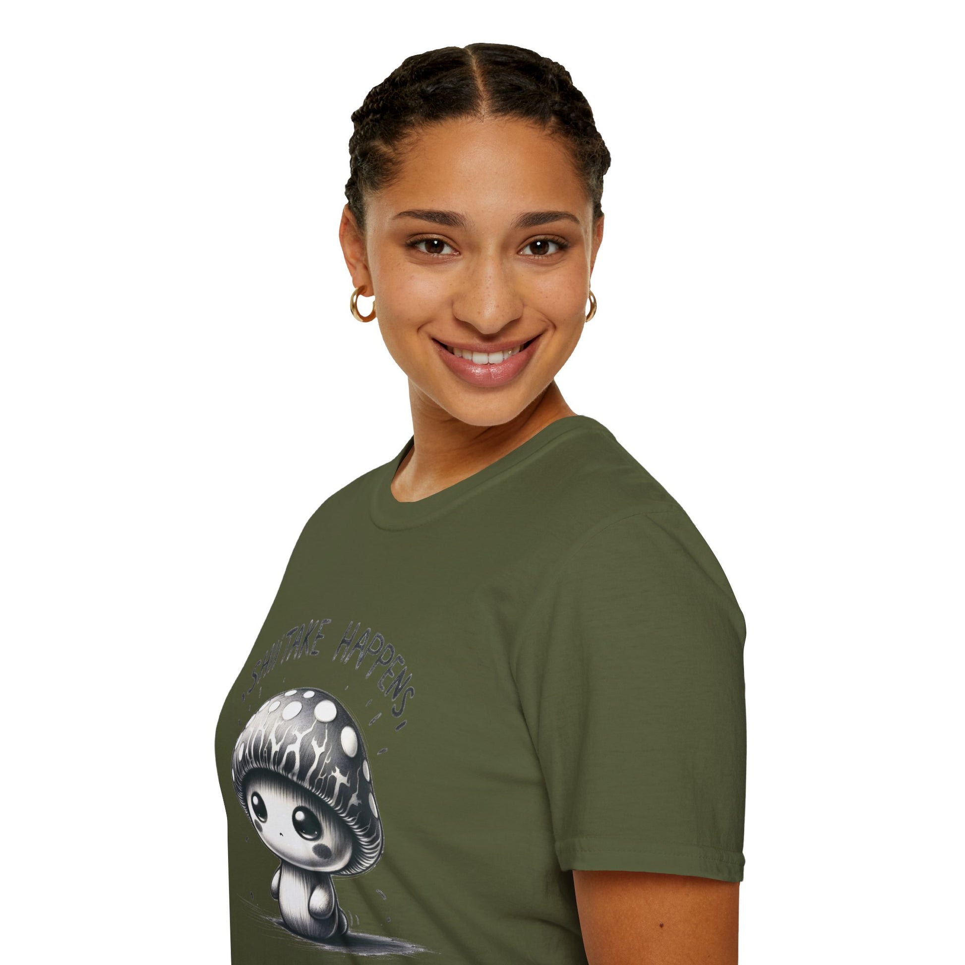 Cute Shiitake Happens Mushroom Shirt - Black and White Fungi Graphic Tee, Playful Pun Shirt, Soft Cotton Unisex Top