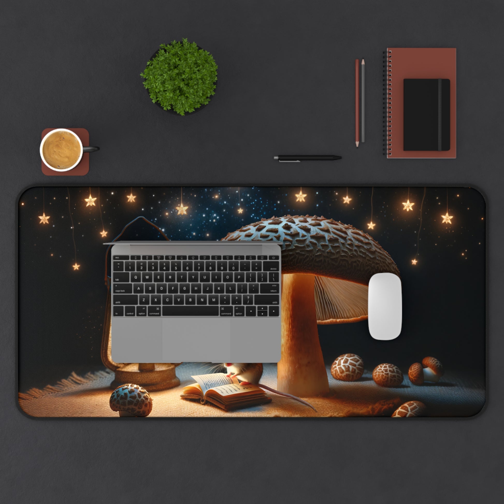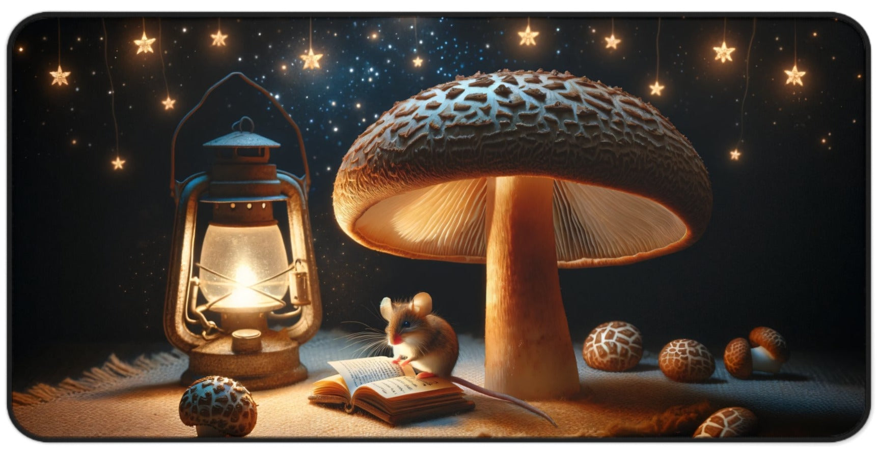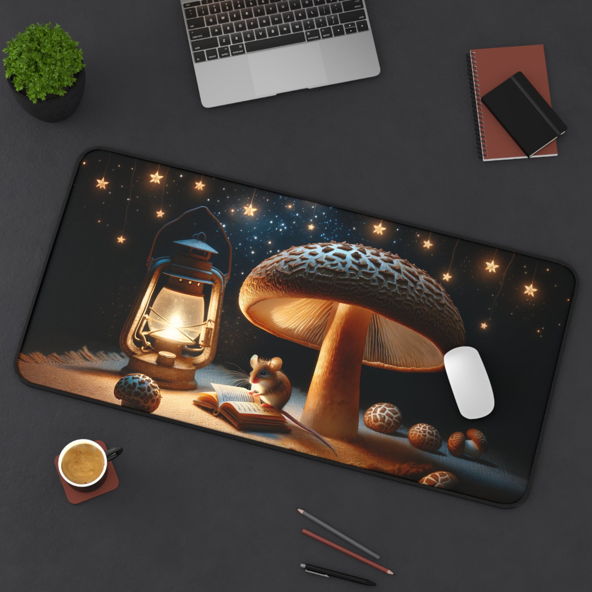 Transform your desk into a magical workspace with our Enchanted Forest Desk Mat. π This extra-large mat (31.5"x15.5") is not just a base for your keyboard and mouse, but a portal to a whimsical world. Immerse yourself in the tranquility of a starlit forest scene featuring a studious mouse engrossed in a book under a grand mushroom, all illuminated by the warm glow of a lantern.