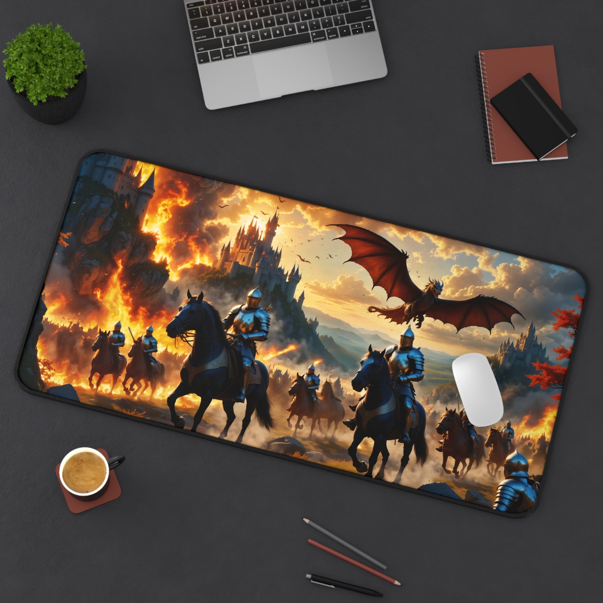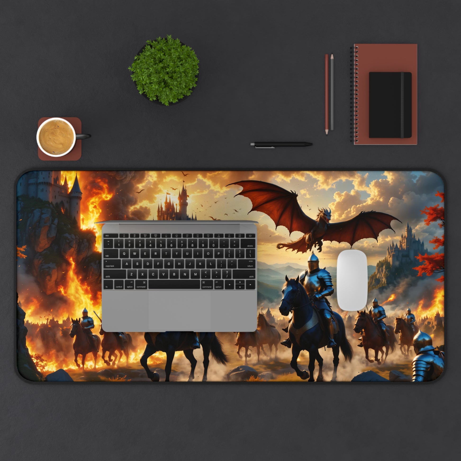 Immerse yourself in the epic fantasy world with our "Epic Medieval Battle" desk mat. Measuring 31.5" x 15.5", this neoprene gaming and office mat features a stunning scene of armored knights charging into battle, with majestic castles and fiery dragons soaring in the background. Perfect for gamers, creatives, and lovers of mythical tales, this desk mat not only enhances your workspace but also adds a touch of adventure to your daily routine.