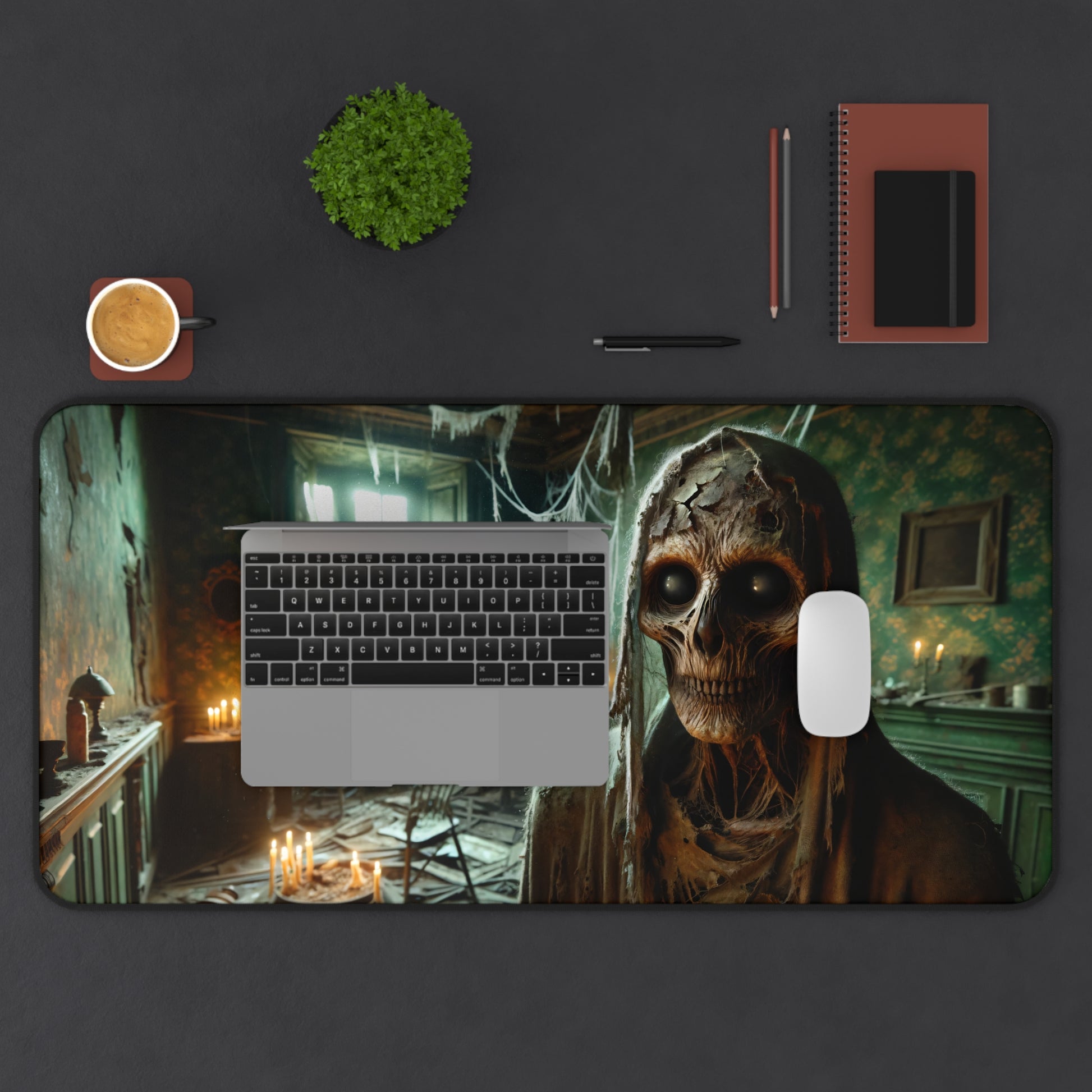 Dive into the eerie and captivating world of the Haunted Specter Gaming Desk Mat. Featuring a spine-chilling design of a spectral figure in a dilapidated, candlelit room, this desk mat brings a hauntingly unique atmosphere to your gaming setup. The large 31.5"x15.5" surface ensures ample space for your mouse and keyboard, while the smooth texture enhances precision. Perfect for gamers who appreciate a touch of the macabre, this mat is both a functional and striking addition to any desk.