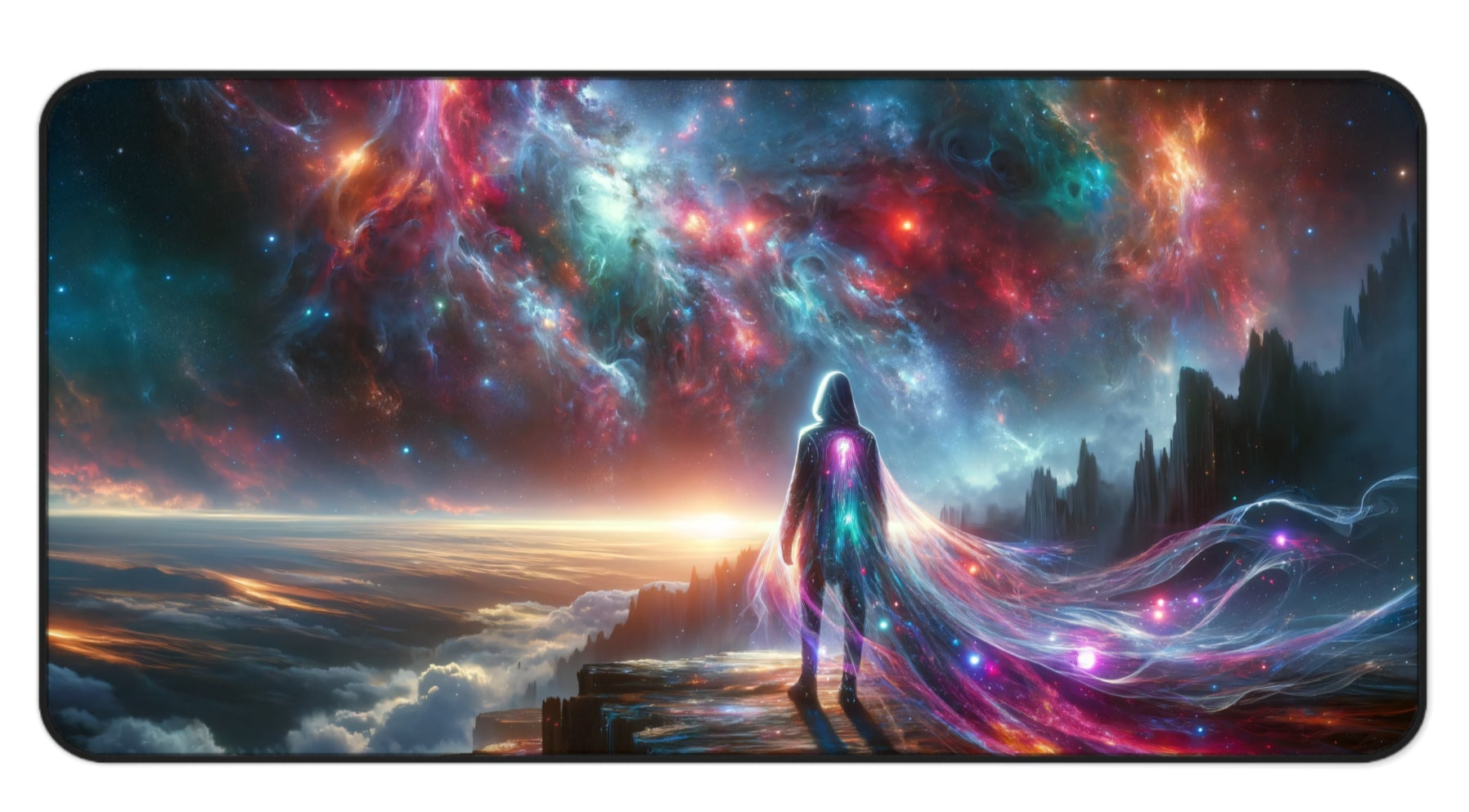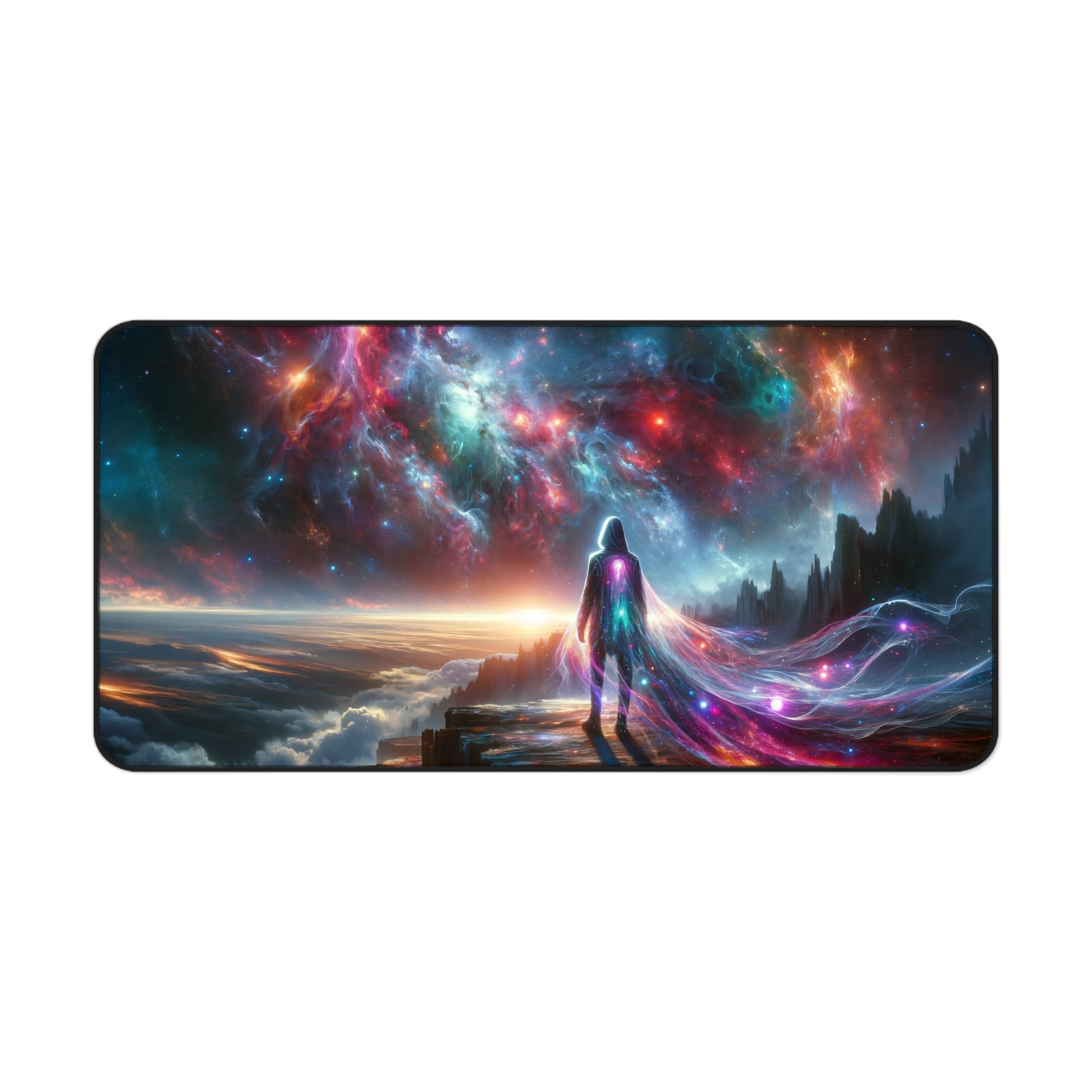 Elevate your gaming experience with the Interstellar Traveler: Cosmic Cliffside Vision Gaming Desk Mat. This 31.5"x15.5" desk mat features a mesmerizing, high-resolution image of an interstellar traveler standing on the edge of a cliff, overlooking a breathtaking galaxy. The traveler's glowing, futuristic cloak and the vibrant cosmic scene create a captivating centerpiece for any gaming setup.