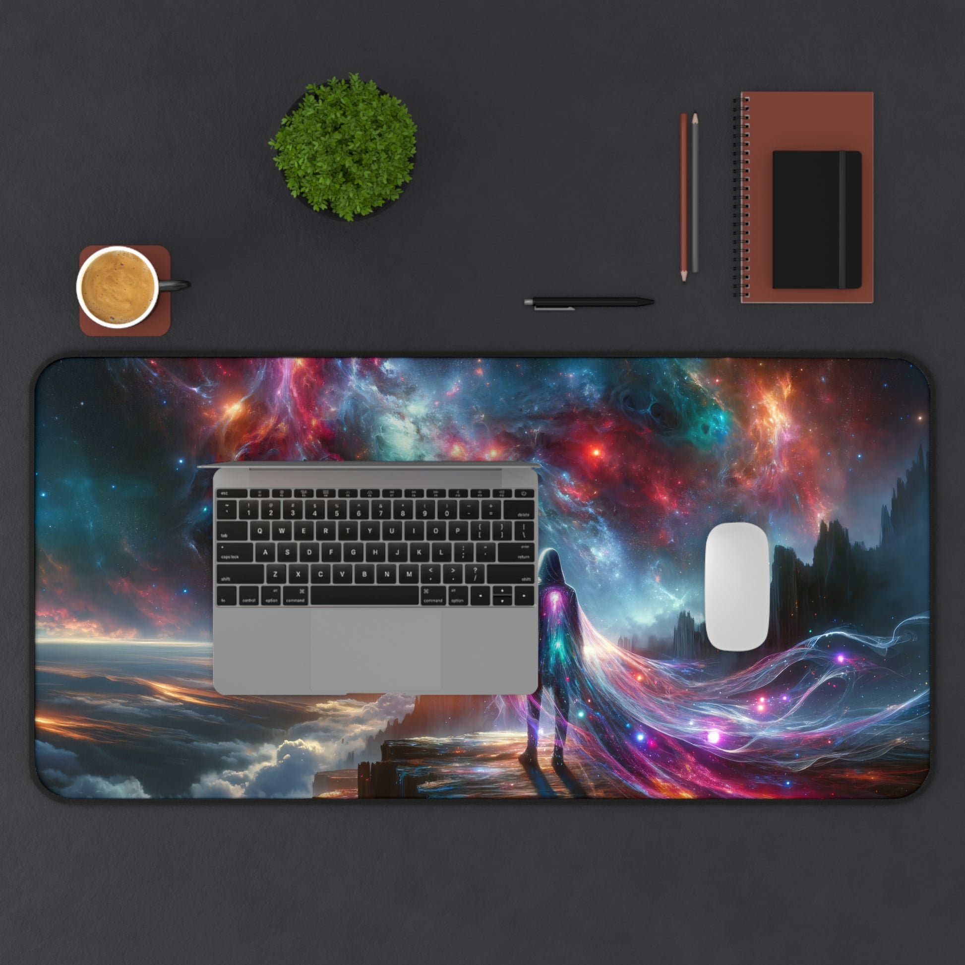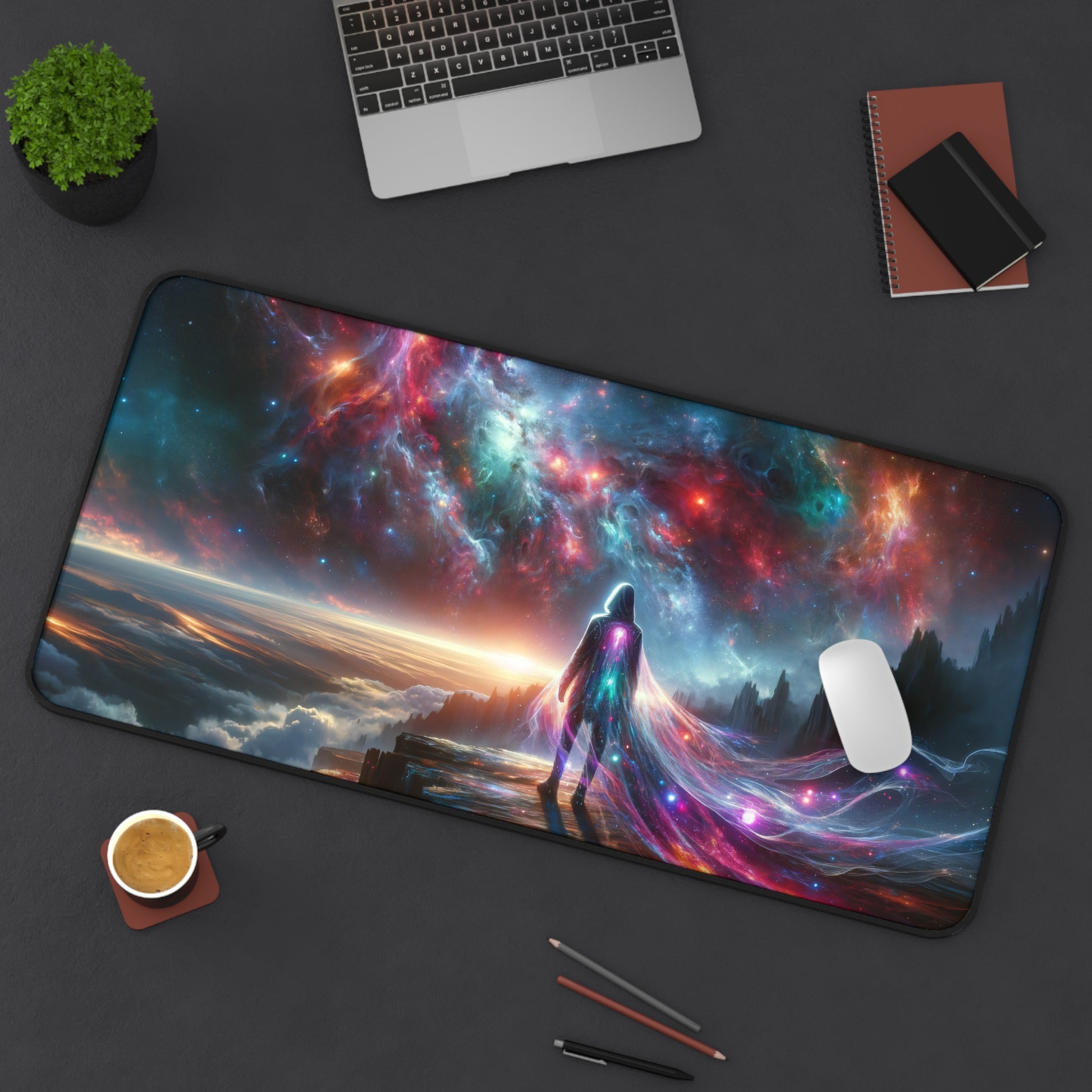 ✨ Transform your gaming and work experience with the Interstellar Traveler: Cosmic Cliffside Vision Gaming Desk Mat - 31.5"x15.5". Order now and let your setup shine with the beauty and wonder of the cosmos! 🌟