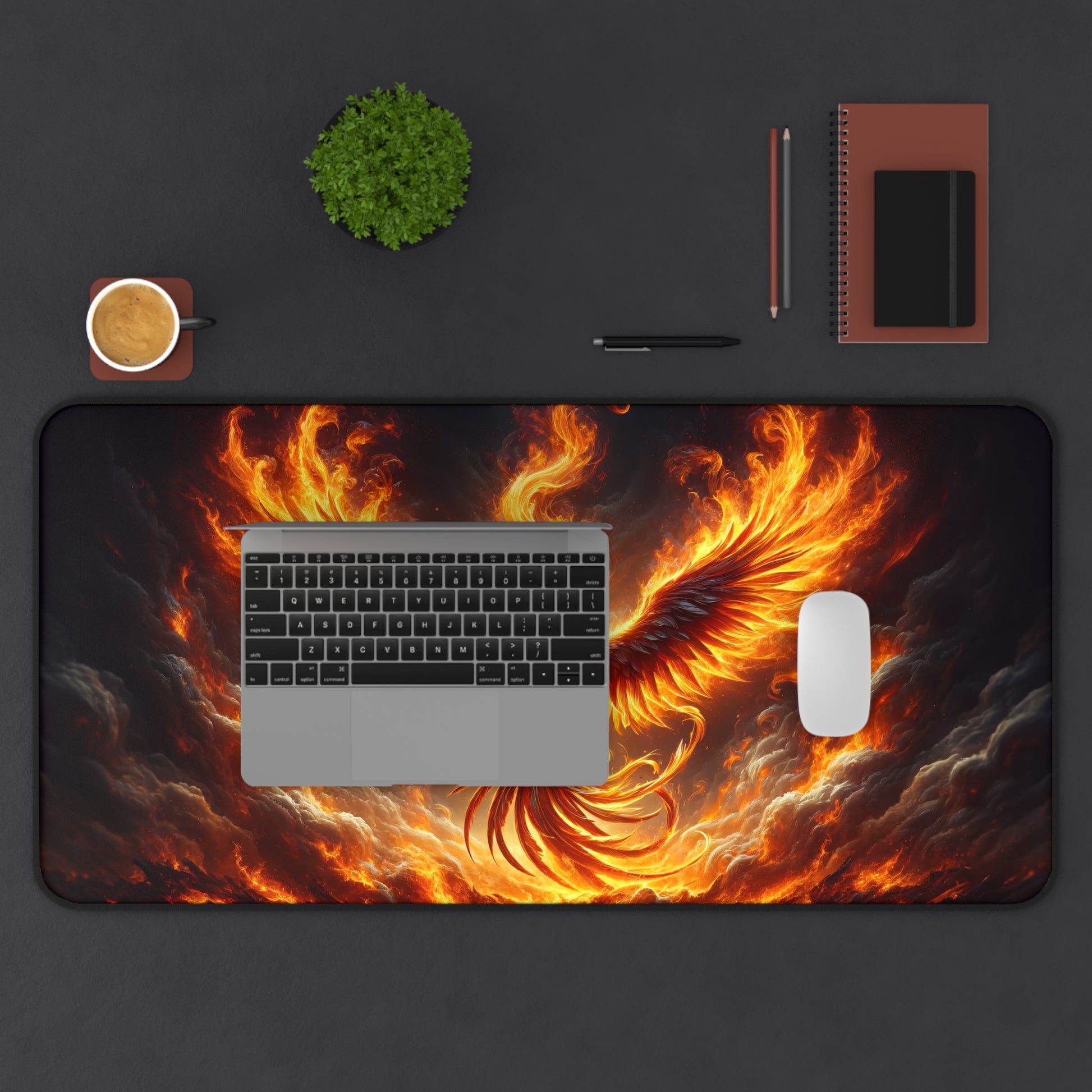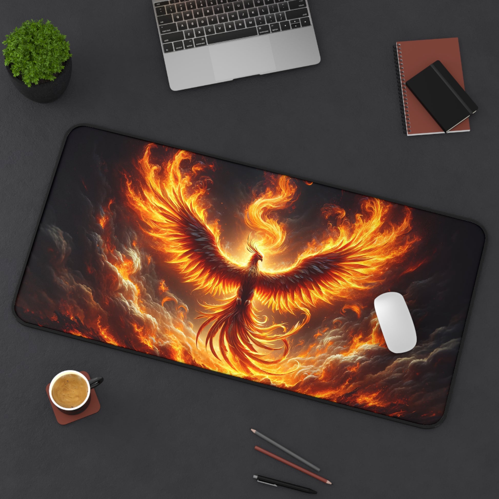 Elevate your gaming experience with the Majestic Phoenix Gaming Desk Mat. This 31.5"x15.5" desk mat showcases a breathtaking, high-resolution image of a phoenix with outstretched wings, engulfed in flames symbolizing rebirth. The vivid depiction of the phoenix rising from its ashes amidst vibrant, super-detailed flames will captivate your senses, making this mat a striking centerpiece for any gaming setup.