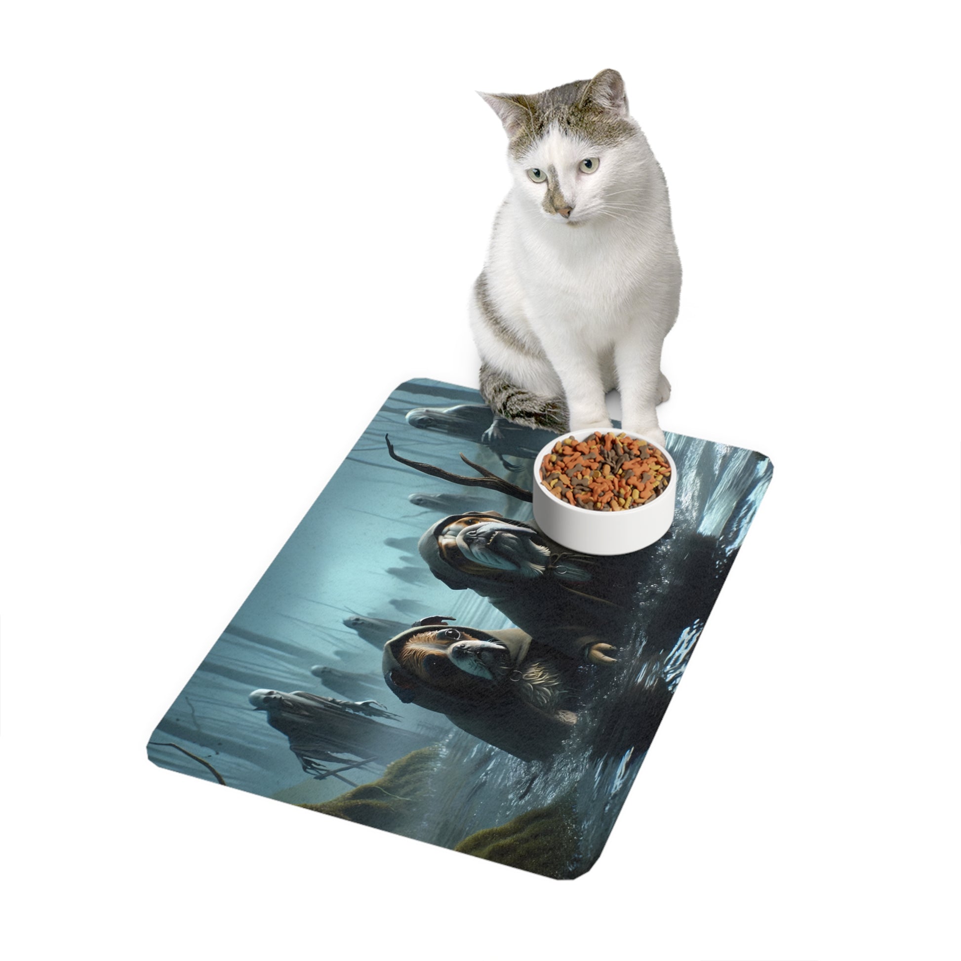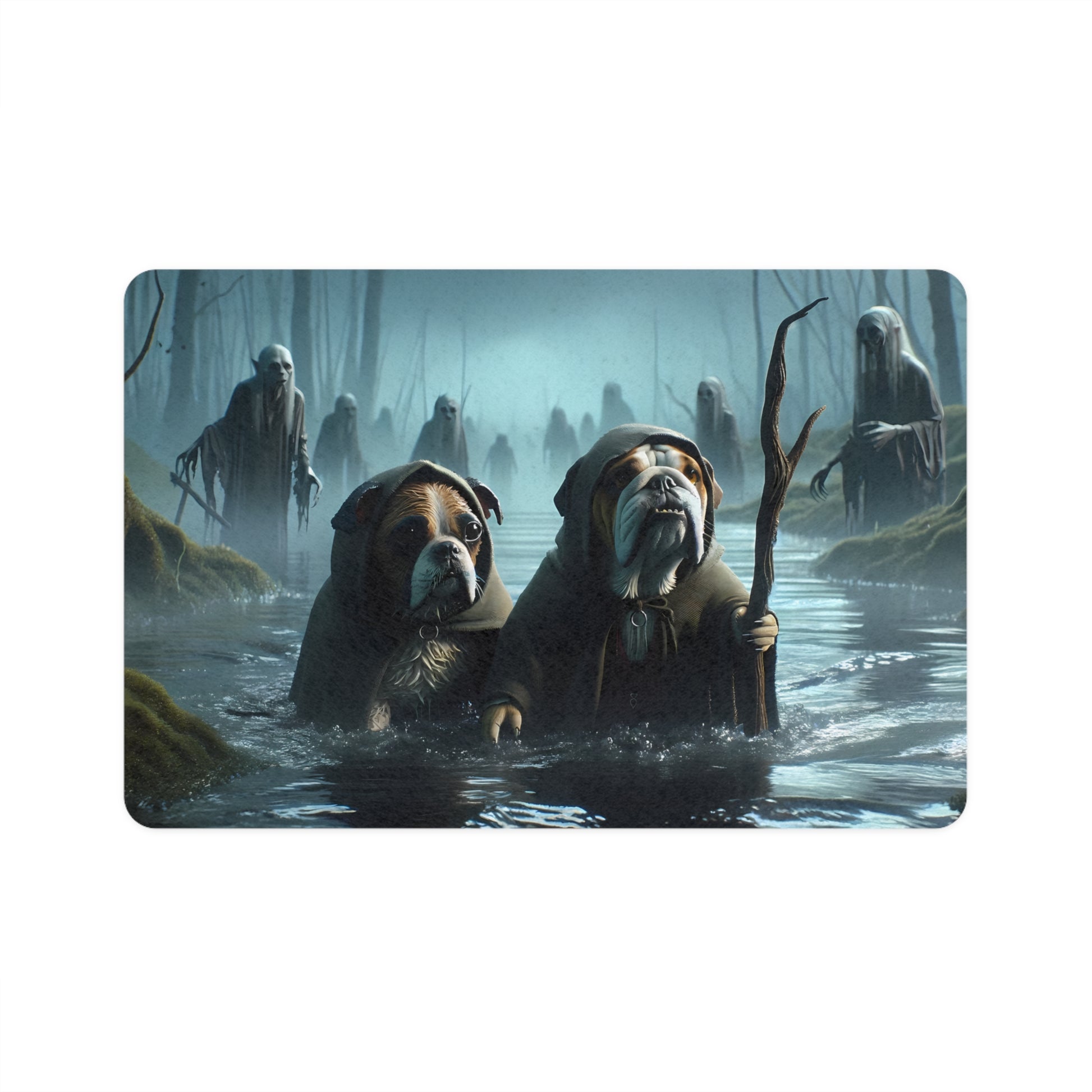 Take your furry friend on an adventure through the mystical marshes with our Bulldog Quest Pet Food Mat. Measuring 12x18 inches, this mat is the perfect size for your bulldog's food and water bowls. The vibrant and detailed design features iconic Middle-earth elements, making mealtime a magical experience for both you and your pet.