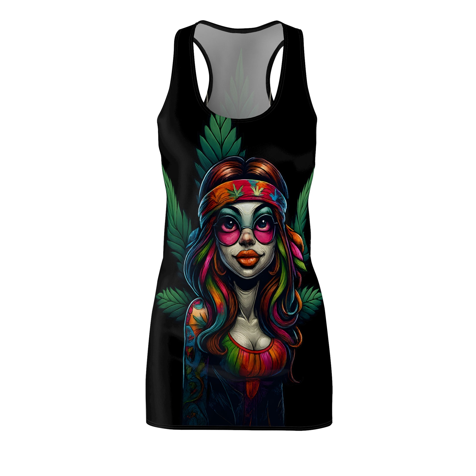 Turn heads and melt minds with this vibrant psychedelic summer racerback dress — a Shiitake Products exclusive for the dreamers, the wanderers, and the beautifully weird. Featuring a bold, graffiti-inspired design of a bohemian hippie girl with flowing rainbow hair and leafy cosmic vibes, this piece radiates energy and freedom. It’s lightweight, breathable, and built for movement — whether you’re dancing barefoot at a festival, wandering the boardwalk, or just vibing under the sun. Made for those who don’t blend in, this dress is your wearable piece of art — part rebellion, part comfort, all Shiitake. Perfect for summer days, music festivals, beach trips, art shows, and anyone living life in full color.