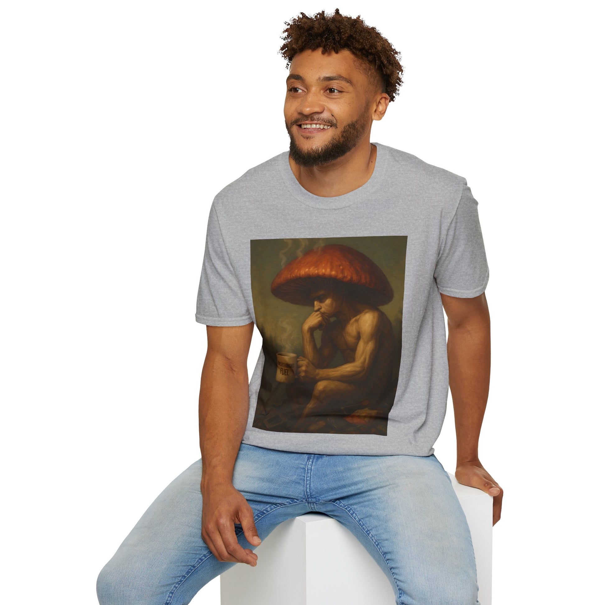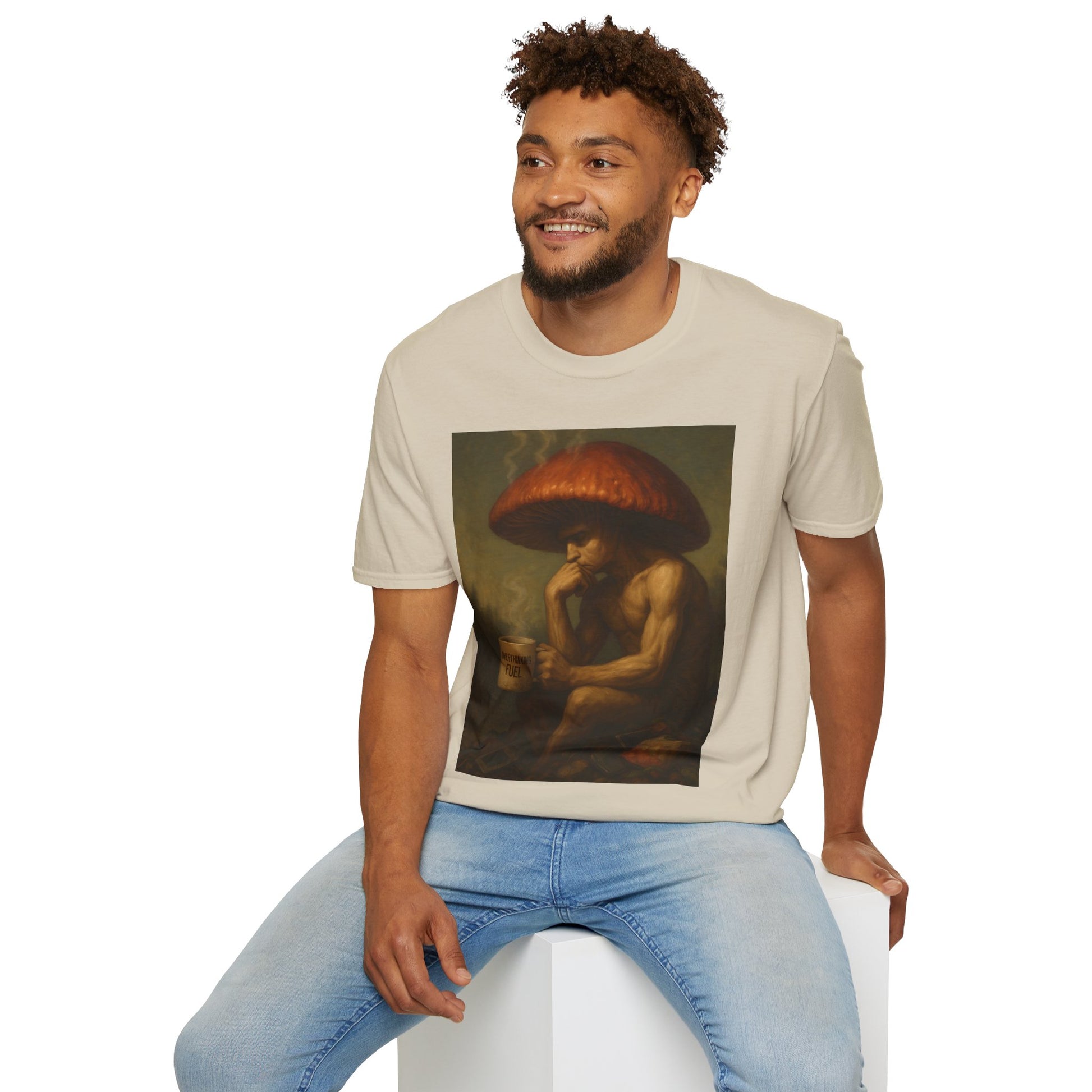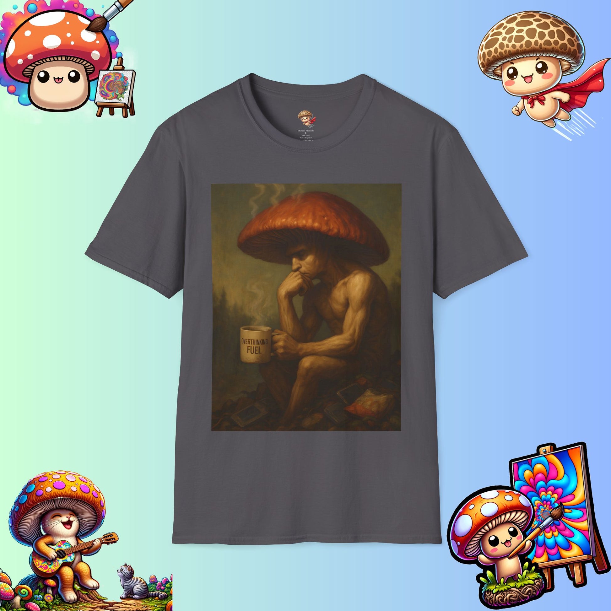 🎨 Design: Original Shiitake Products artwork of The Overthinker — detailed, painterly realism that fuses humor and existentialism.